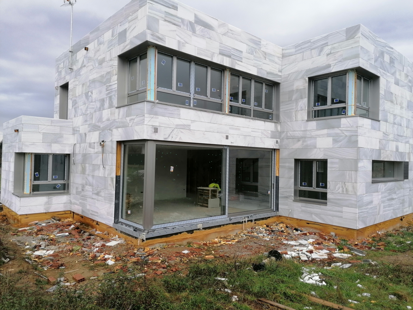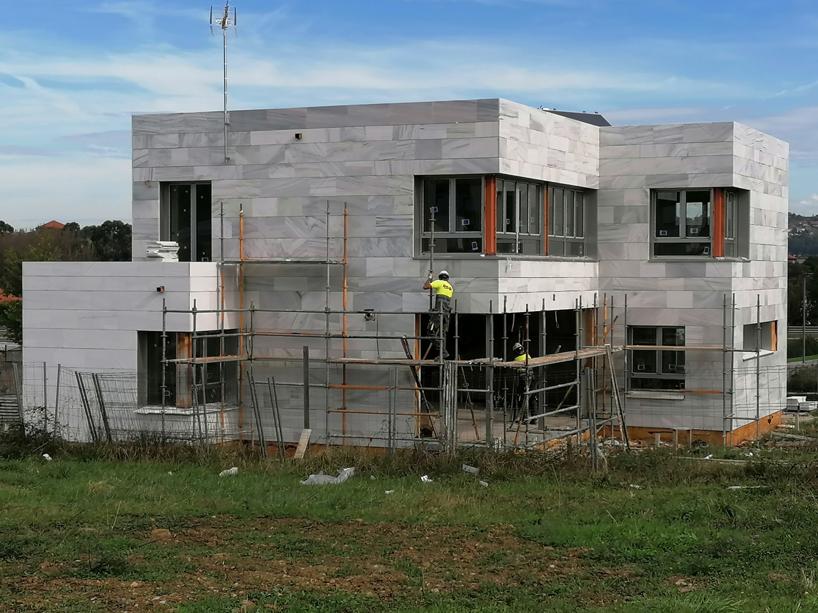 En exteriores podemos ofrecerle fachadas amorteradas, que utilizan los sistemas de fijación tradicionales, pero muy especialmente fachadas ventiladas, un sistema de revestimiento en el que somos expertos y recomendamos a todos nuestros clientes por las ventajas que ofrece.